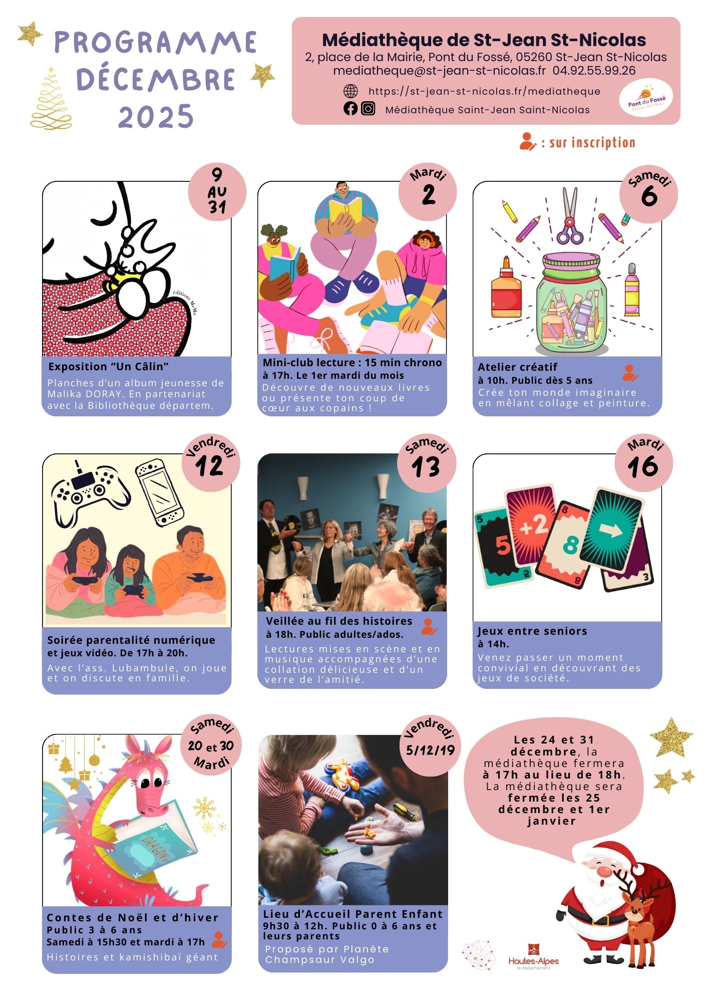 La médiathèque propose des animations tout au long de l’année : contes, lectures, ateliers créatifs/ numériques, rencontres, expositions,…